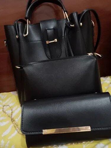 Introducing the Aura 3 Pcs Black Bag Set – a perfect blend of sophistication and practicality. Crafted from high-quality PU leather, this classic black set is designed for modern women who value both style and utility. It includes a spacious main handbag, a compact makeup pouch, and a sleek mini wallet – making it ideal for everyday use, work, travel, or events. The bold black tone paired with gold metal accents adds a timeless touch of elegance.